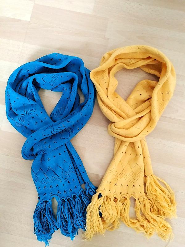 Два однакові шарфи, з однаковим візерунком та однаковим складом нитки. Розрізняються лише за кольором. Склад нитки: 45% високоякісної віскози, 30% звичайна віскоза, 15% ангора, 10% спандекс. Довжина кожного шарфа 2 метри + бахрома 12 см. Ціна одного шарфу – 120 грн (при купівлі двох шарфів). Шарфи продаються по окремості, але краще 2 одразу, так дешевше :) Дивіться всі мої оголошення, у продажу є ще шарфи і шапки.