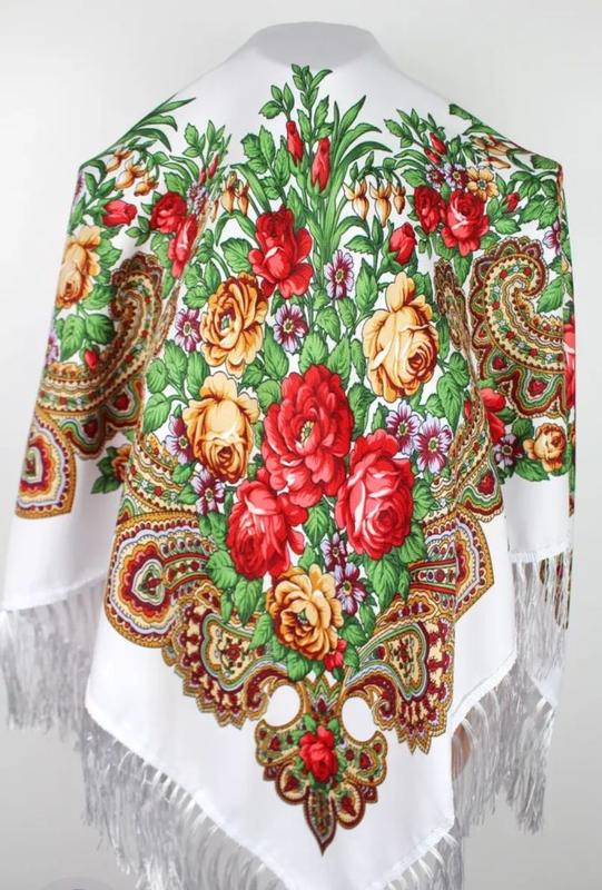 товар новий та відповідає фото. Розмір без китиць 100*100см, довжина китиці 10см. Колоритна хустина у білому кольорі надасть неповторності та вишуканості вашому образу. Хустку можна пов’язати на голову або покласти на плечі. Шовкові китиці прикрашають виріб з чотирьох сторін по краям.