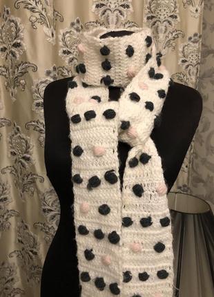 Білий в'язаний шарф з сірими та рожевими кульками.