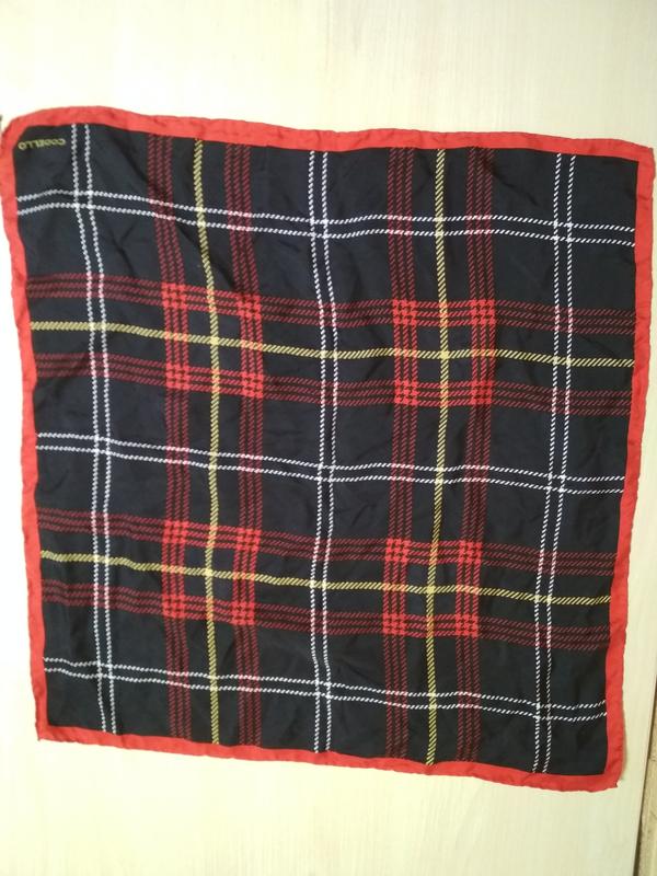 Шовковий хустку Codello, стан відмінний, шов роуль, малюнок дуже стриманий, на чорному тлі лінії червоного, білого та жовтого кольору утворюють клітку, розмір 52х53. За безпечною оплатою відправляю тільки Укрпоштою або Justin.