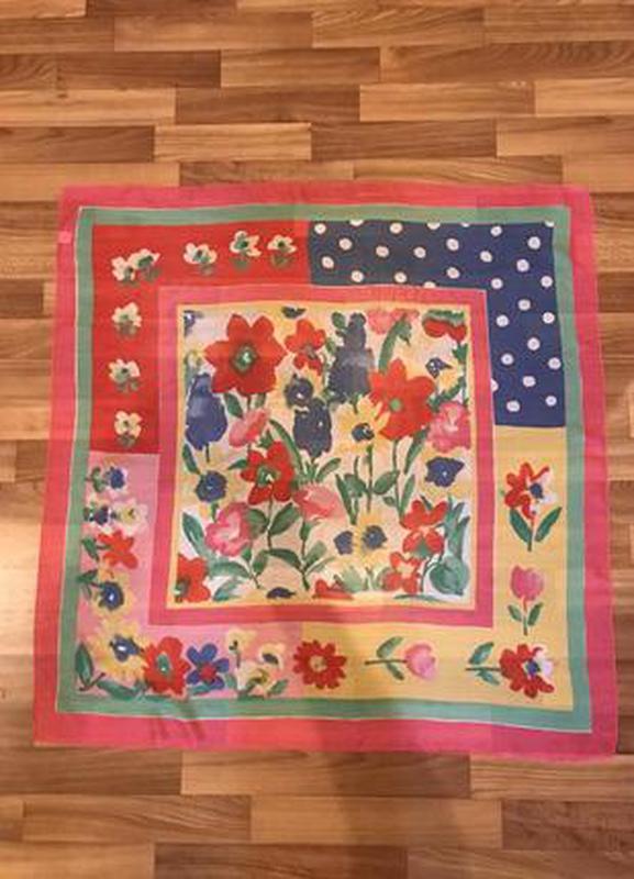 Очень красивый и стильный дизайн платка. Есть бирка,материал полиэстер,но по структуре очень похож на легкий шёлк. Состояние идеальное,небольшой дефект (фото вблизи),несколько стетиков на просвете-в цене учтено. Размер 88*90 Доставка Укрпочта и Нп, безопасной оплаты нет, читайте отзывы покупателей и раздел о продавце