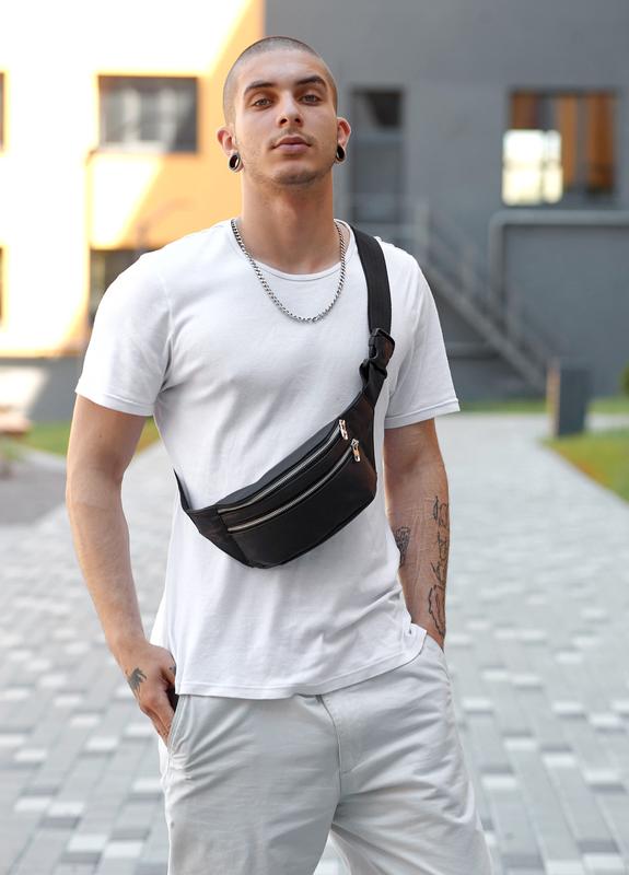Сумочка из натуральной кожи на пояс, бананка Sambag - отличный вариант для людей, которые следят за модными тенденциями Характеристики: Материал верха: натуральная кожа. Кожа водоотталкивающая, устойчивая к выцветанию, эластичная (не трескается при эксплуатации) и прочная на разрыв. Подкладка. Материал оксфорд средней плотности, прочный, устойчивый к царапин, легко чистится, нитки из него не выбираются. Благодаря соединению всех частей подкладки между собой, нагрузка на экокожу уменьшается и распределятся равномерно. Это продлевает срок службы кожи и швов извне. Фурнитура. Металлическая молния. Бегунки металлические с фиксатором: сумка не откроется самостоятельно от нагрузок, а только рукой. Основное отделение на молнии. Фастекс-застежка из прочного современного пластика. Шлейки. Плечевый ремень из текстиля, надежно пришитый на планку по спинке. Подсоединен к бокам кожаными треугольниками. Длина регулируются с помощью металллицочкового регулятора. Функциональность. Снаружи спереди сумки карман на молнии. Внутри сумки отдельное одно отделение, которое разделено на несколько карманов. Снаружи на спинке сумки один карман на молнии. По умолчанию поставляется на обхват по талии (через плечо) от 86 см до 123 см: ремень регулируется. При заказе в комментарии задайте необходимую длину ремня, если она отличается от стандартной. Размер: самого кармана бананки 22х12х4 см, а длина с "ушками" по бокам 30,5 см. Сумки доступны во всех цветах.