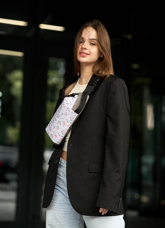 Жіноча сумка на пояс бананка sambag holster msh чорна тканева з квітковим білим принтом