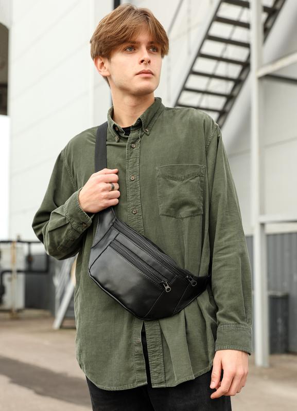 Сумочка из натуральной кожи на пояс, бананка Sambag - отличный вариант для людей, которые следят за модными тенденциями Характеристики: Материал верха: натуральная кожа. Кожа водоотталкивающая, устойчивая к выцветанию, эластичная (не трескается при эксплуатации) и прочная на разрыв. Подкладка. Материал оксфорд средней плотности, прочный, устойчивый к царапин, легко чистится, нитки из него не выбираются. Благодаря соединению всех частей подкладки между собой, нагрузка на экокожу уменьшается и распределятся равномерно. Это продлевает срок службы кожи и швов извне. Фурнитура. Металлическая молния. Бегунки металлические с фиксатором: сумка не откроется самостоятельно от нагрузок, а только рукой. Основное отделение на молнии. Фастекс-застежка из прочного современного пластика. Шлейки. Плечевый ремень из текстиля, надежно пришитый на планку по спинке. Подсоединен к бокам кожаными треугольниками. Длина регулируются с помощью металллицочкового регулятора. Функциональность. Снаружи спереди сумки карман на молнии. Внутри сумки отдельное одно отделение, которое разделено на несколько карманов. Снаружи на спинке сумки один карман на молнии. По умолчанию поставляется на обхват по талии (через плечо) от 110см до 165 см: ремень регулируется. При заказе в комментарии задайте необходимую длину ремня, если она отличается от стандартной. Размер: 38*17*6 см. Сумки доступны во всех цветах.