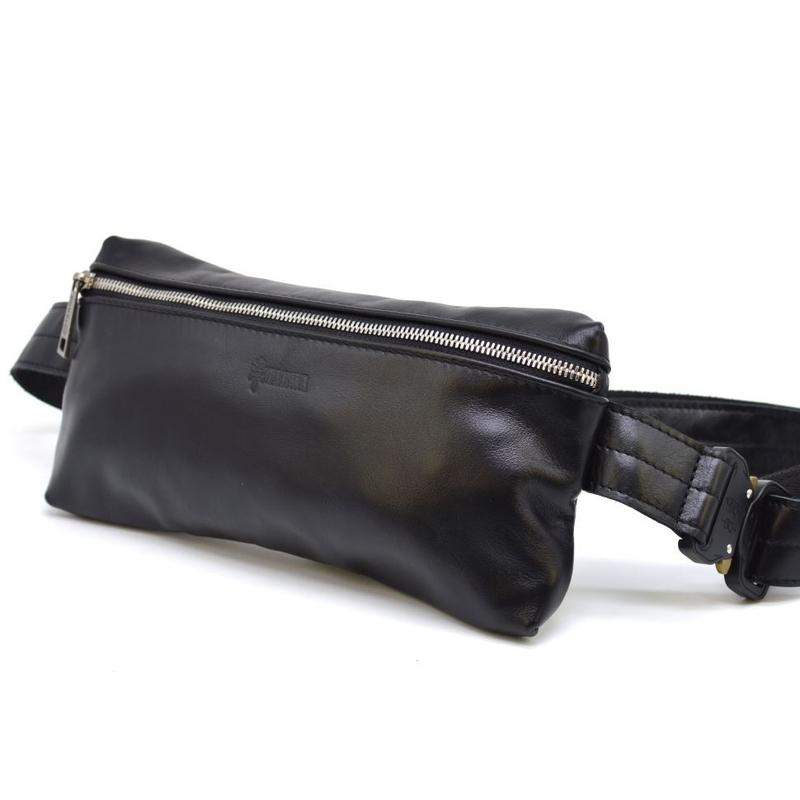 Сумка на пояс із натуральної гладкої телячої шкіри GA-1818-4lx від українського бренда TARWA. Колір чорний. Фурнітура — срібло Шкіра — наппа Підкладка — є тканинною Ремінь — шкіряний Внутрішні кишені — одна, на блискавці Відділень — одне основне Зовнішні кишені — одна тильна Розміри: 27x15x3 см. Модель на кожен день, дальніх поїздок і подорожей. Дуже добре підходить як для чоловіків, так і дівчат. Основне відділення закривається на блискавку в кольорі — срібло. Усередині є врізна кишеня з блискавкою. На задній стороні також є врізна кишенька. Сумка поясна обладнана шкіряним регульованим ремінцем із металевою фурнітурою (надійний металевий фастекс). Сумка брендована логотипом TARWA.