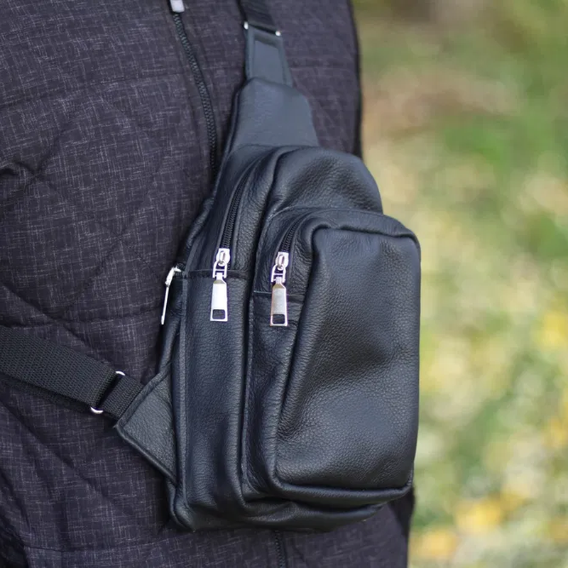 Стильна сумка чоловіча - бананка, слінг нагрудна з натуральної шкіри на блискавці чорна