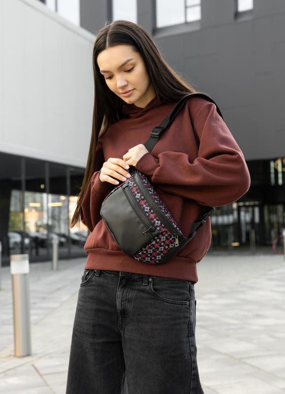 Сумка на пояс Tirso черного цвета Большая женская сумка на пояс - это твой ключ к свободе движения. Бананка на пояс или через плечо - неотъемлемый атрибут активных людей: она удобна, вместительна и, как следствие, практична. Характеристики черной сумки на пояс Tirso Max Материал верха: новейшая экокожа повышенного уровня износостойкости (не менее 50 000 циклов по тесту Мертиндейла). Кожа водоотталкивающая, устойчивая к выцветанию, эластичная (не трескается при эксплуатации) и прочная на разрыв. Подкладка: материал оксфорд средней плотности, прочный, устойчивый к царапинам, легко чистится, нитки из него не выползают. Благодаря соединению всех частей подкладки между собой, нагрузка на экокожу уменьшается и распределятся равномерно. Это продлевает срок службы кожи и швов извне. Фурнитура: молнии из надежного пластика. Бегунки металлические с фиксатором: сумка не откроется самостоятельно от нагрузок, а только рукой. Основное отделение на молнии. Фастекс-застежка из прочного современного пластика. Шлейки: плечевой ремень из текстиля и натуральной кожи, надежно пришит на планку по спинке. Подсоединен к бокам кожаными треугольниками. Длина регулируется с помощью металлического регулятора. Функциональность: снаружи спереди сумки два кармана. Внутри сумки отдельное одно отделение, которое разделено на несколько карманов. Снаружи на спинке сумки один карман на молнии. По умолчанию поставляется на обхват по талии (через плечо) от 110 см до 165 см: ремень регулируется. При заказе в комментарии задайте необходимую длину ремня, если она отличается от стандартной. Размер: 38*17*6 см.