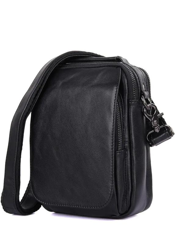 Матеріал: натуральна шкіра високої якості; Колір: чорний; Розміри (ШхВхГ, см): 16х22х6. Артикул: 14451 Зручна чоловіча сумка, має компактні розміри і приємну на дотик м'яку шкіру. Вона прекрасно виглядає і зручна у використанні, її можна носити в руці і на плечі (за допомогою плечового ременя, який йде в комплекті). У цій сумці можна носити багато невеликих аксесуарів, таких як невеликий блокнот, гаманець, візитки, переносна зарядка для телефону, ну і сам телефон. Вона прекрасно підійде для подарунка чоловікові до будь-якого свята ну або просто так. Характеристики: - 2 основних відділення, закриваються на блискавки; - на лицьовій стороні містка кишеня на блискавці, яка додатково закривається клапаном на магніті; - в основному відділенні є потайна кишеня на блискавці; - на задній стінці є кишеня на блискавці; - регульований плечовий ремінь.