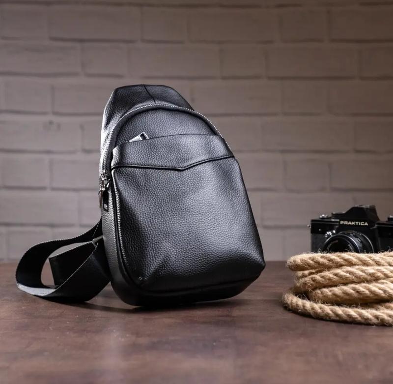 Колір: чорний; Матеріал: натуральна шкіра високої якості; Розмір (ШхВхГ, см): 17,5х30х6,5; Артикул: 14857 Всередині: - основна кишеня на блискавці; - потаємний відділ на блискавці; - накладна кишеня на блискавці; - кишеня відкритого типу на тильній стороні; Сучасна модель сумки. Аксесуар просто необхідний людям, які люблять компактні сумки. Сумка досить містка, незважаючи на свій невеликий розмір. Виконана з натуральної шкіри флотар, яка довго і не проблематично носиться. З таким аксесуаром вам буде зручно ходити на роботу, водити авто і відправлятися в подорож. Сумка буде ідеальним вибором для подарунку близькій людині.