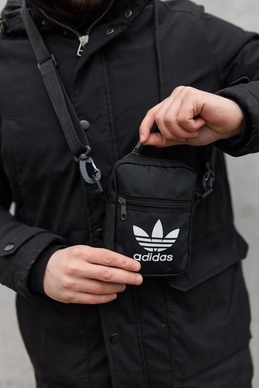 Чорна барсетка small Adidas білий логотип: - Розмір: 18*13 см; - Матеріал: Оксфорд 1000 D - синтетичний матеріал, що володіє водовідштовхувальним просоченням; - Логотип: накатка біла Adidas; - регульований знімний ремінь, якісна фурнітура; - Основна кишеня на блискавці, всередині додаткова підкладкова кишеня (без змійки); - Додаткова кишеня на тильній стороні барсетки; - Додаткова передня кишеня на блискавці. Логотип-накатка; - Зворотний бік барсетки має додатковий поролоновий ущільнювач, що дозволяє виробу добре тримати форму. Барсетка підходить для повсякденного міського стилю, а також під спортивний стиль. Звільнить руки та кишені, а також доповнить Ваш стильний образ.