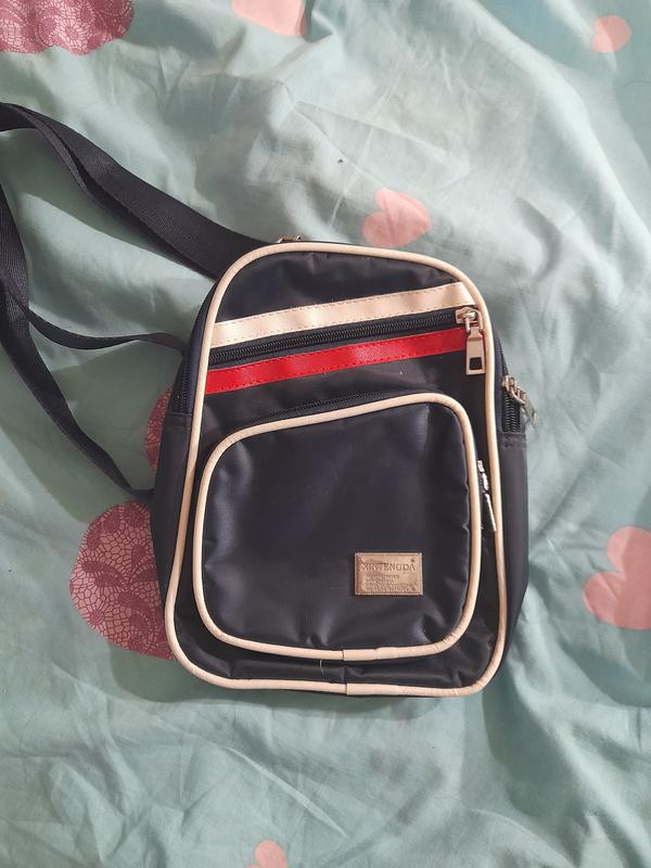 Продается мужская сумка-барсетка через плечо, темно-синего цвета, с белыми и красной декортивными линиями и металлическую вставку с выбитым на ней логотипом по центру, имеет три отделения с застежкой на молнии. Высота -24 см, Ширина - 15 см, длина ручки -33 см.