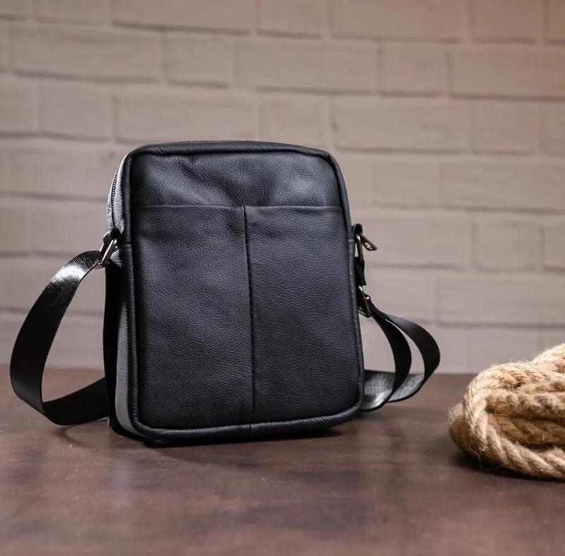 Колір чорний; Матеріал: натуральна шкіра високої якості; Розмір (ШхВхГ, см): 19,5х17х5; Артикул: 14994 Особливості: - основне відділення на блискавці; - кишеня відкритого типу для телефону; - кишеня на тильній стороні на блискавці; На лицьовій стороні: - накладна кишенька на магнітній кнопці. Сучасна чоловіча сумка з натуральної шкіри. Виріб стане просто знахідкою для чоловіків. Виріб продумано до дрібниць і має оригінальний дизайн. Сумка доповнена якісною фурнітурою. Доповнена модель текстильним регульованим ремінцем. Закривається на блискавку. Сумка буде відмінним подарунком для близької людини.