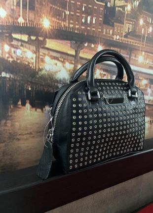 Чудова сумочка з якісноі шкіри , виріб виконано дивовижно , Модний стиль , під відомий бренд . Сумка насичено - чорного кольору з якісною фурнітурної срібного кольору , на лицьовій стороні виробу закльопки. Зручний варіант для прогулянок , для походу в кіно , кафе , на будь-яке свято , ресторан і ін . Розміри : Висота виробу 16 см Довжина виробу 20 см Глибина виробу 10 см . Всередині є три кишеньки , один з яких на змійці , другі поменше без змійок - для дрібниці , карток . У сумки якісна соібна фурнітура , яка не облазить , не змінює колір . Додатково йде довга ручка 140 см , регулюється під себе . Дивіться інші мої речі і сумки в профілі .