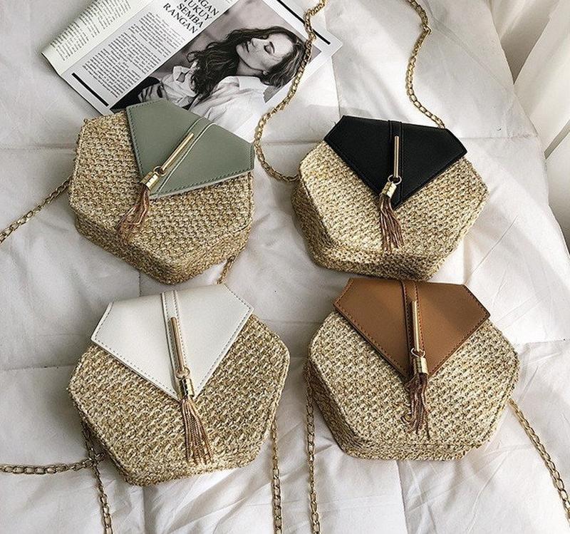 ## Міні сумочка клатч жіноча літана солом'яна шестигранна ### ### Характеристики: - ### Довжина плечового ременя: 130 см; - ### Плечовий ремінь: ланцюжок (входить в комплект); - ### Довжина нижньої основи: 12 см; - ### Довжина по центру: 21 см; - ### Висота: 19 см; - ### Ширина основи: 6 см.