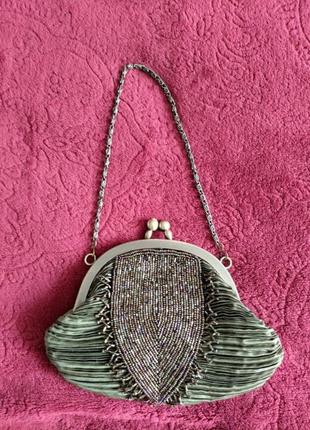 клатч вечерний, цвет хаки, с одной стороны расшит бисером, длина цепочки 15см, размеры сумочки на фото. детали уточняйте, возможны дополнительные фото.
