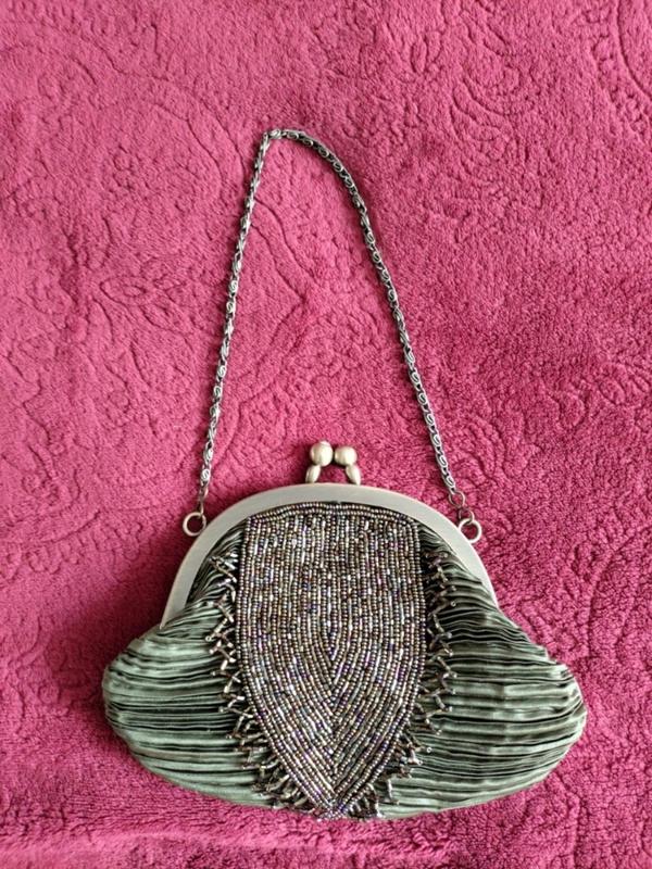 клатч вечірній, колір хакі, з однієї сторони розшитий бісером , довжина ланцюжка 15см, розміри сумочки на фото. деталі уточнюйте, можливі додаткові фото.