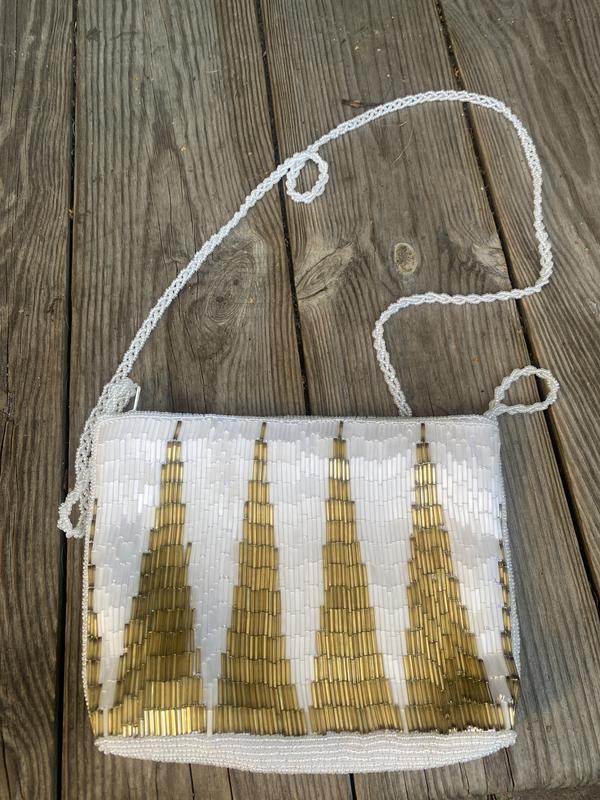 Гарна ніжна нарядна сумочка з бісеру. Колір білий з золотистим.Всередині-тканина атласна слівочного кольору(є маленький карманчик). Застібка-блискавка. Стан відмінний, лише всередині є незначні світлі плямочки.