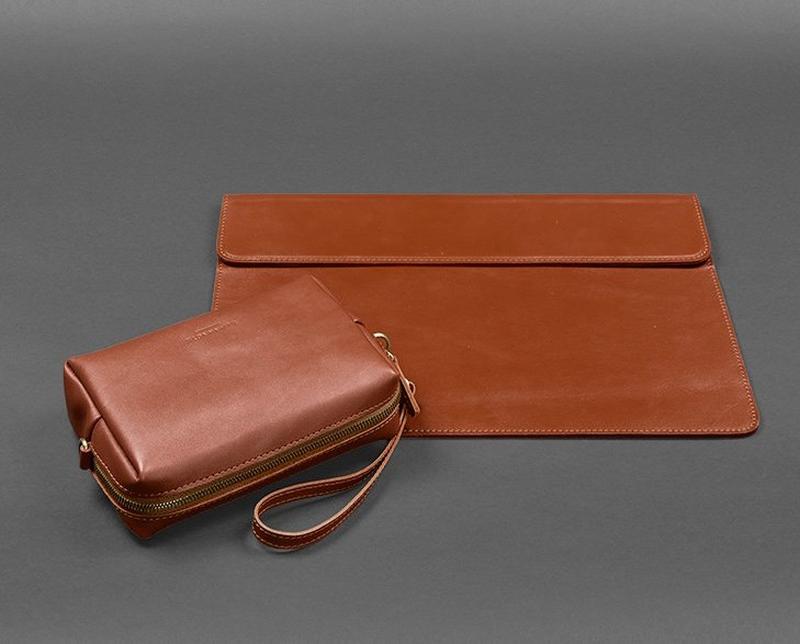 Набір шкіряний світло-коричневий косметичка, чохол для ноутбука