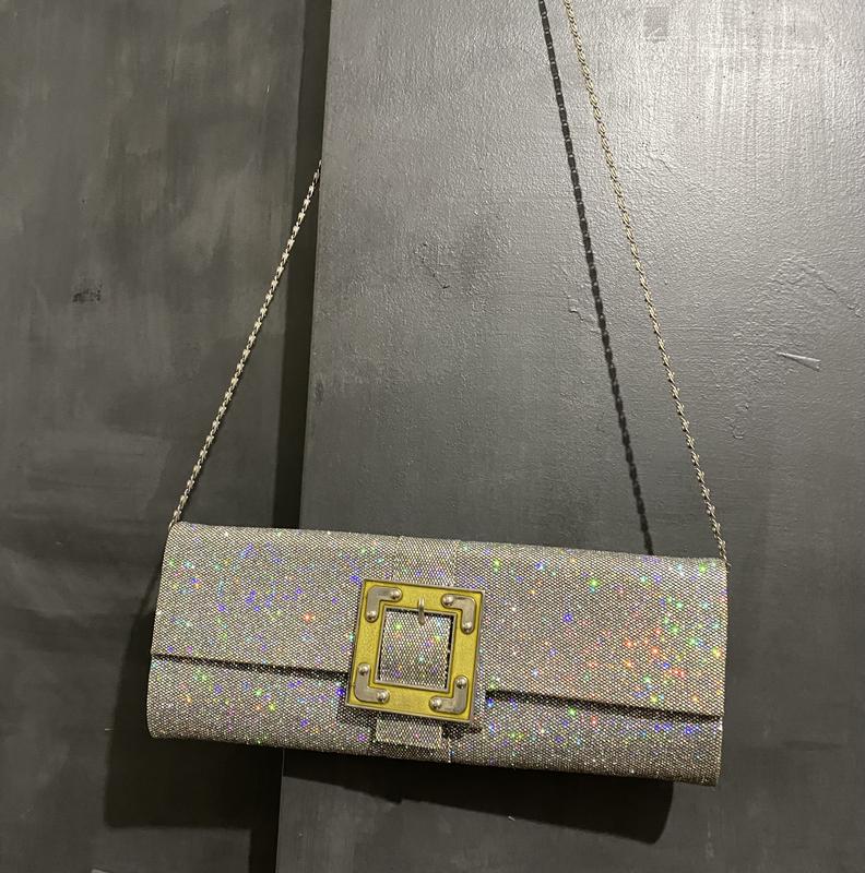 Блискучий клатч, має райдужний колів, матеріал наче міленька луска) Металевий ланцюжок трохи потемнішав Довго лежала, чекала свого часу, але на жаль зі мною так і не дочекалася