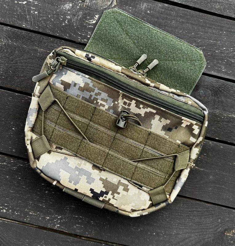 Кілька примірників у наявності Розмір 25*20*5 см Тактичний напашник для предметів першої необхідності. Має відділ для встановлення балістичного захисту! Має велику загальну кишеню з відділом на липучці під кевлар, для додаткової безпеки, та додадкову кишеню на фронтальній частині підсумка. Напашник легко кріпиться на тактичне спорядження за допомогою надміцної, широкой липучки. Фронтальна велика велкро-панель має інтерфейс MOLLE, що дозволяє прикріплювати до сумки додаткове спорядження, патчі, тощо. Знизу підсумка еластична вставка для розміщення турнікету. Виготовлена з міцної, водонепроникної тканини Cordura 900D. Для пошиву використовується поліамідна стропа. Напашник прошитий армованими нитками, що підвищує термін служби виробу. Розмір напашника 25 х 20 х 5,5см розмір: Мультикам