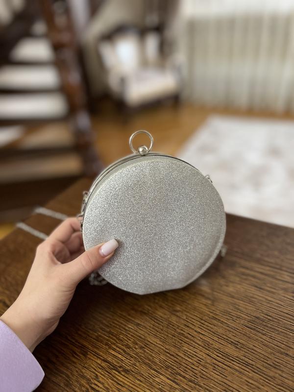 Клатч серебристого кольору, кругла з цепочкою