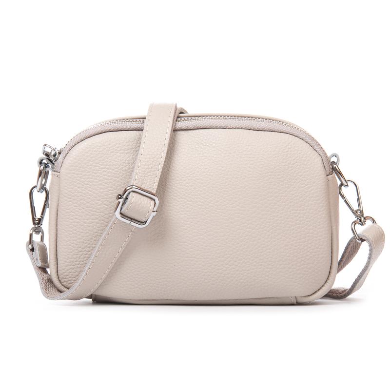 . Виготовлена із натуральної м'якої шкіри. Два відділення, що закриваються на блискавці. Усередині відділень є відкрита бічна кишеня та кишеня на блискавці. Зовні сумочки на звороті знаходиться кишеня на блискавці. У комплекті регульований плечовий ремінь. Розмір (см) 22*15*7