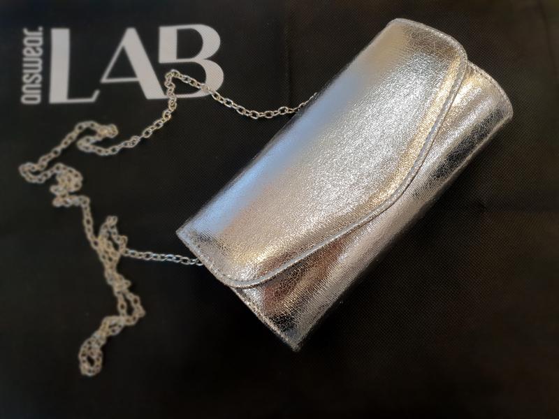 Сумка-клатч сріблястого кольору. Штучна шкіра. Магнітна кнопка. Ручка-ланцюжок (відстібається). Всередині невеличка кишенька.