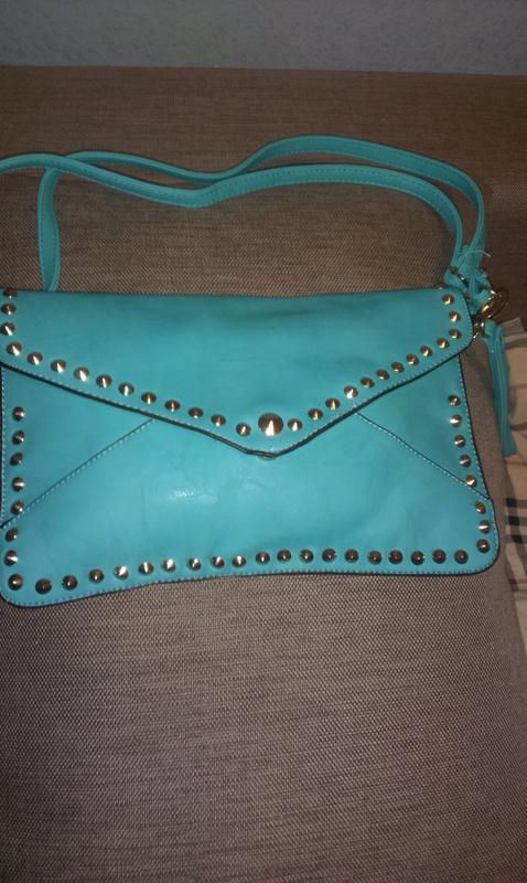 Очень красивая сумка клатч ,на длинной регулируемой ручке и короткой .Цвет мята ,по краям украшена шипами,очень качественный кожзам,фурнитура ,и подкладка,имеется кармашек на молнии .Новая!!!!Ширина 33см,высота 21см,глубина 19см