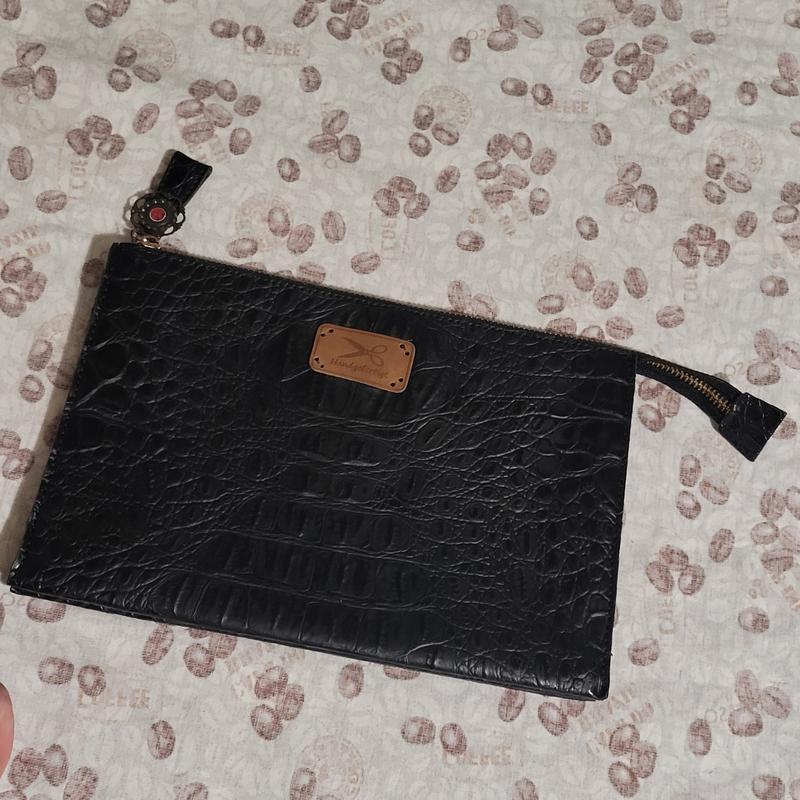 Клатч б/у, шкірзам, 3 відділення +2 маленькі відділення, довгої ручки немає, але позаду є для неї кріплення. Розмір 24.5*27 см.