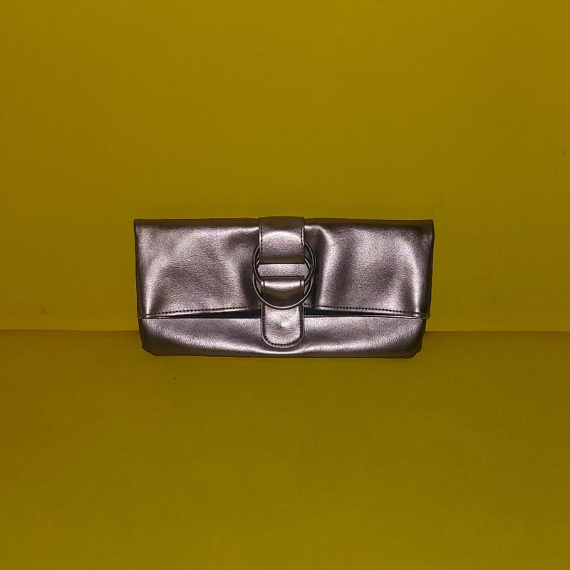 Святкова сумка-клатч сіро-срібного кольору. Стан-ідеальний Неперевершене доповнення до святкового образу. Закривається на магнітну кнопку. 2 кишеньки: одна ззовні, одна-в середині Розміри в складеному вигляді:13×27 см
