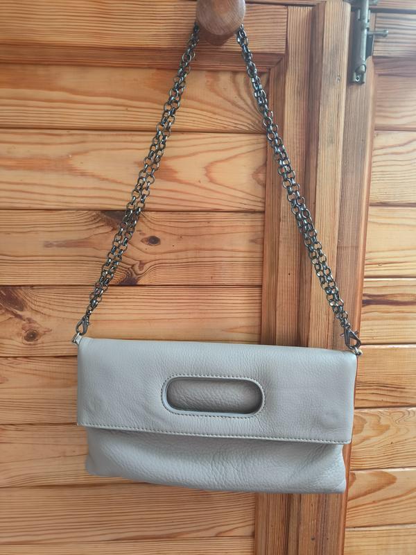 Клатч з натуральної м'ясистої шкіри, 27/15, у розкладеному стані 27/24. Всередені має кармани з обох боків, один на блискавці. Ланцюжок можна по різному застібати, або носити на довгому ланцюжку, або вдвічі складати. Застібається на магніт. В ідеальному стані!