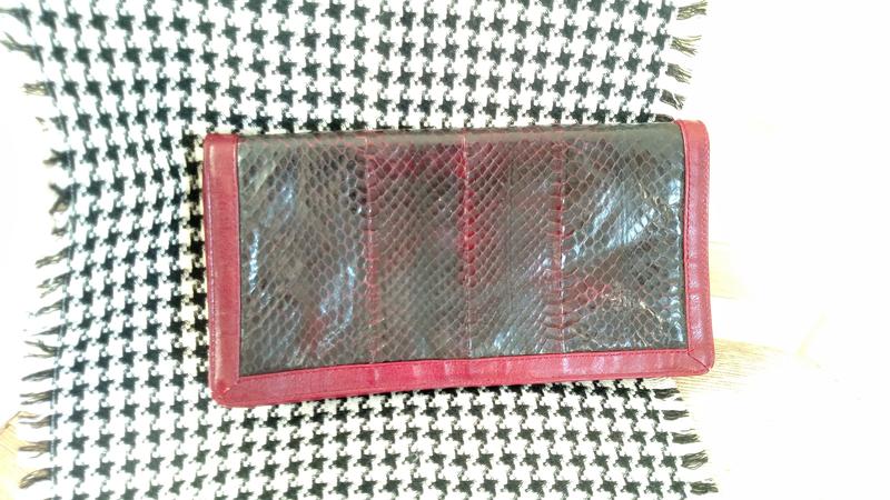 Продам гарний клатч, поєднання бордовою гладкої шкіри та натуральної зміїної шкіри. Все ціле. Колір зміїної шкіри рівномірний, на фото спалах спотворила колір. Є дефект на кнопочці. Вся фурнітури працює добре.