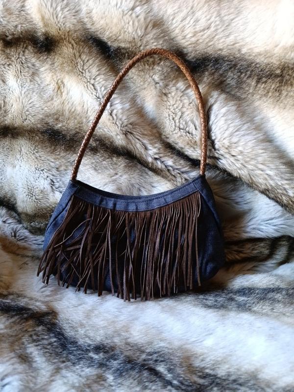 джинсова сумочка з бахромою і плетеною ручкою. застібається на кнопку. всередині три відділення, середнє на блискавку. стан нової речі. ширина 27 висота 15 ручка 46