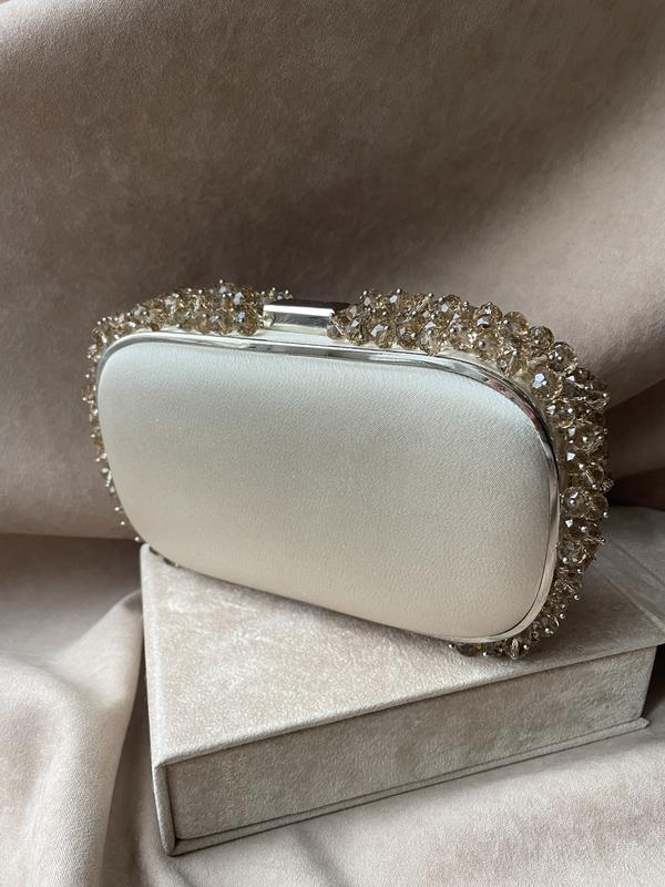 Эффектная текстильная минисумочка, цвет ткани песочный перламутр, по бокам щедрая окантовка хрусталем, крупные граненные бусины на эффектных серебристых швензах, аккуратная и кропотливая ручная работа, цвет бусин шамуа, размер 10*16*4 см, цепочка съемная, идеально чистый подклад. акцентный, яркий и игривый клатч, куплен в Италии, надежная съемная цепочка, звенья округлые, ткань на одежде не цепляет, верхняя прямоугольная застежка Второй клатч тауп (тоже с цепочкой) в продаже. Оба элегантные, нейтральные, практически к любой цветовой гамме. Не столько на выпускной или свадьбу, а в клуб, на выставку, музыкальный вечер или в театр, ресторан. Есть нюанс после ношения, покажу на фото, в цене учтено ✔️