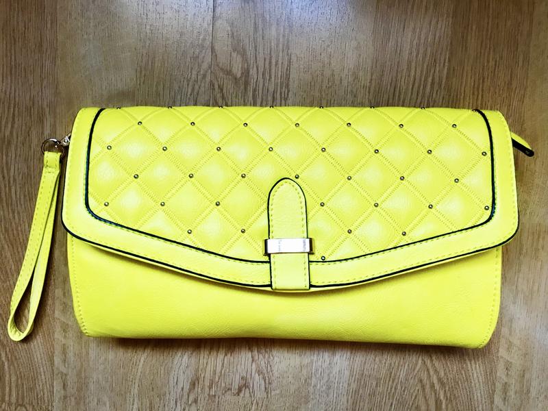 Сумка-клатч желтого цвета. Замеры: ширина 30 см, высота 18 см. Состояние идеальное, носила 1 раз. Эко кожа. Фурнитура в золотом цвете. Ремешок можно пристегнуть(как на первом фото).