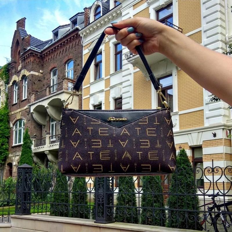 Не велика сумочка клатч. Основний матеріал шкір.зам., твердий, тримає форму. Колір темно - коричневий з золотистими літерами різного розміру. Тільки трикутник і наплічний ремінь чорного кольору. Фурнітура золотий, як і основний замок. Другий ремінець матерчатий, червоно-чорно-зелений з написом "see you love" Ремінець регулюється, максимальна довжина 142 см Виміри сумки : довжина 25 см, висота 14 см Спереду відділення застібається на магнітну кнопку, із зворотного боку маленька кишенька на блискавці. Основное отделение делится делится карманом на замочке на два отсека + есть маление кармашки для мелочи.