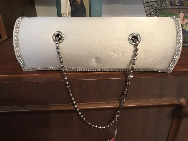 Клатч перлового кольору, круглий Обсипаний по контуру камінчиками і вихід ручок теж в камушках, куплений під наряд, не використовувала(з етикеткою) Всередині вистачить місця для жіночих дрібниць Тканина атлас, але не ковзний На фото є надавленные місця ручкою сумки від зберігання - розправляється через час, так як м'яка підкладка