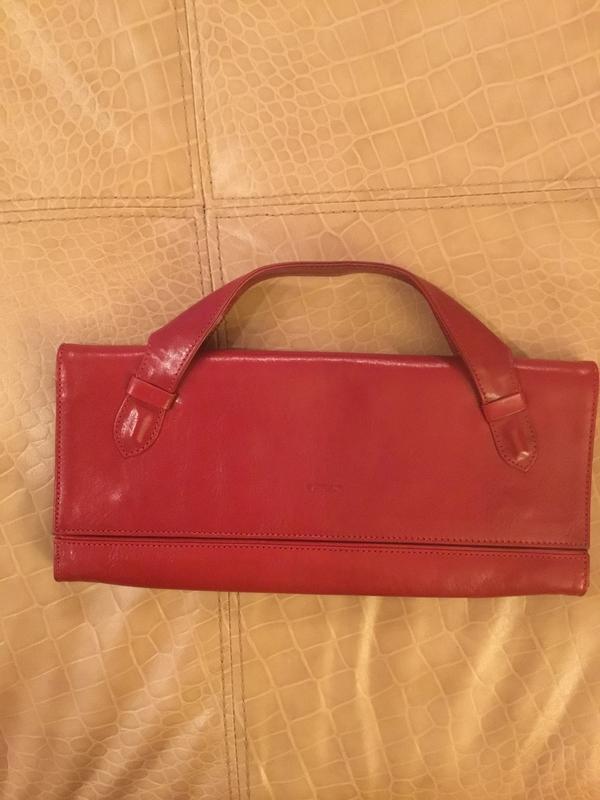 Клатч из полированной кожи. Очень насыщенный бордовый. Фото не очень передаёт. Длина 31см высота 14. Отвечу на интересующие вопросы.