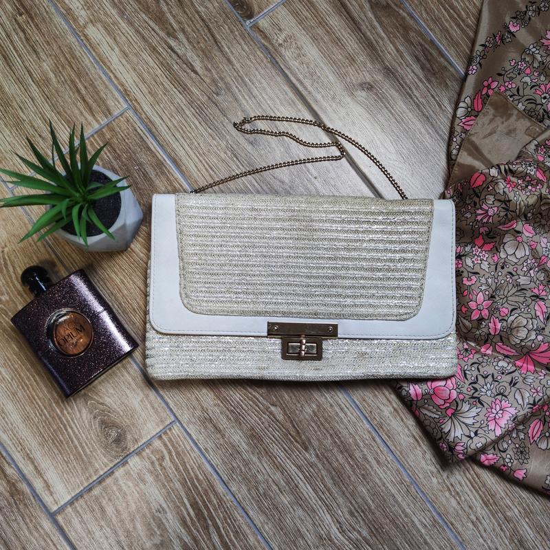 🤍Сумка-клатч з білої еко-шкіри і щільною золотистої тканини з люрексом. Сумка має сліди шкарпетки, все видно по фото, тому віддаю за символічну суму. Бренд New look. Усередині одне відділення і маленький кишеню на блискавці. Ланцюжок не відстібається. 📏 Виміри: висота 18,5; ширина 30,5; довжина ланцюжка 74.