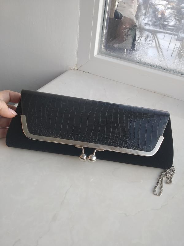 Клатч чорний оксамит і шкіра з тисненням ( штучна) . Застібка магніт. Довжина : низ 29 см, верх 27 см. Ширина 10 см, довжина ручки ( ланцюжок ) 115 див.
