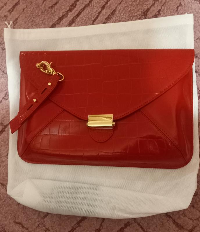 НОВИЙ!шкіряний червоний класичний клатч,два відділення та кишеньки ширина 29см,висота 20см, на защіпку, короткий ремінець,пильовик
