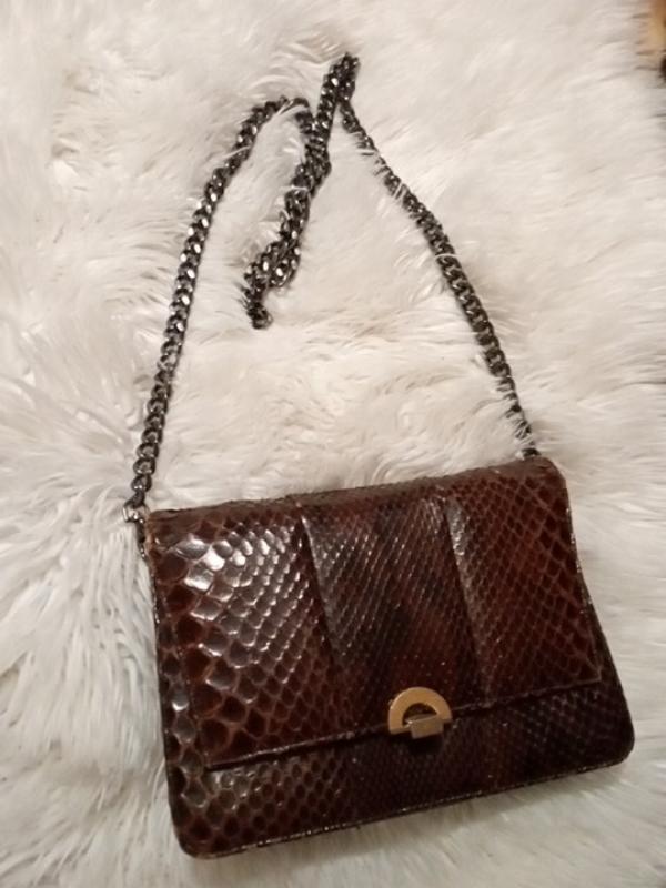 Два відділення, довга цепка, натуральна шкіра рептилії - видно луску. Є туфлі, розмір 40.