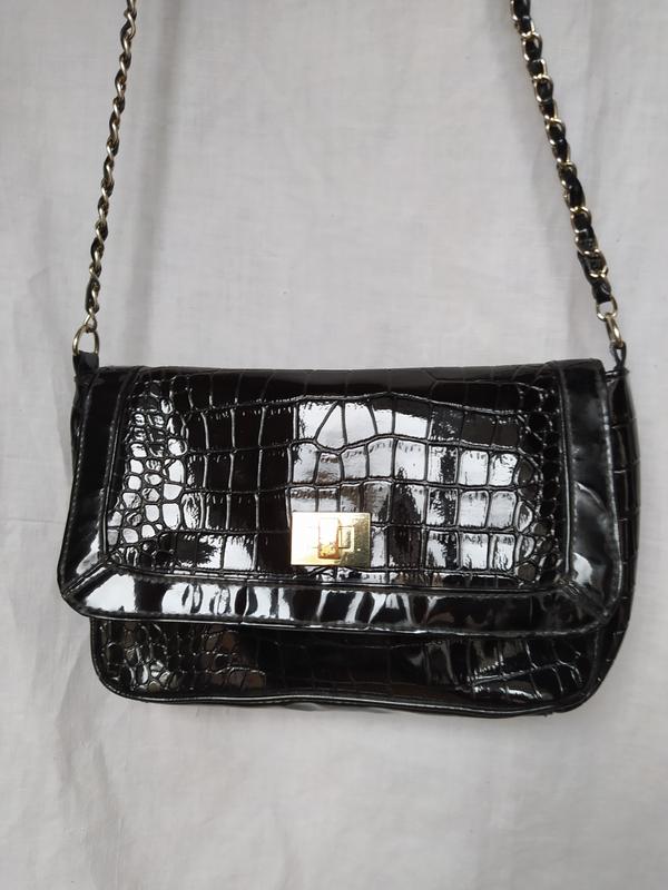 Клатч лакований,в гарному стані.Є дефект на останньому фото: збоку мілка потертість.Кнопка посаджена на клей,що не завадить функціональності сумки. Розмір 28/18/7.В середині кишеня на блискавці. Ланцюг 60см.