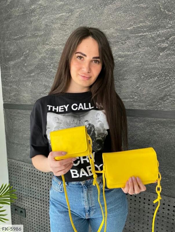 Стильные,яркие сумочки 2 в 1. Ткань:эко-кожа. Цвет:желтый,белый,черный,зеленый сиреневый,розовый. Внутри одно отделение,застегивается на кнопку. Сумка 1:высота-13см,ширина-19см. Сумка 2:высота-10см,ширина-12см. 14.05.