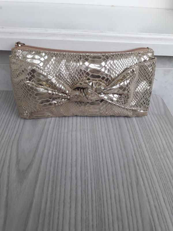 Продам клатч золотистого кольору, матеріал текстиль 100% поліестер, в ідеальному стані без дефектів та слідів шкарпетки, заміри є на фото.