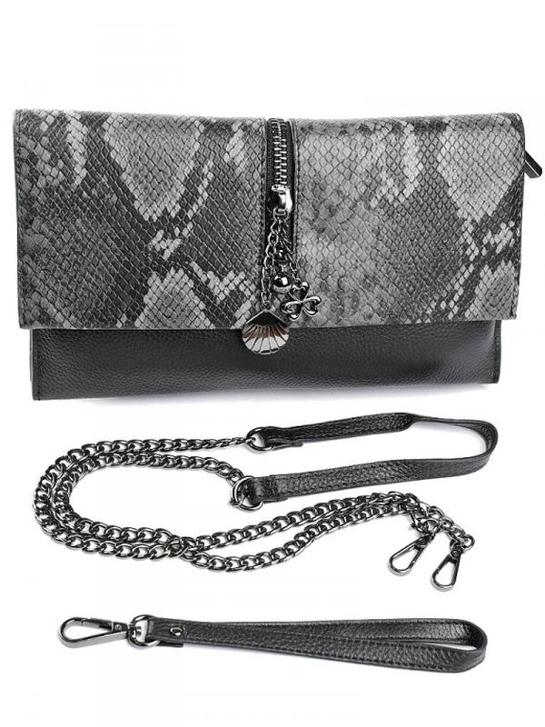 27*16*3 див. клатч Жіночий шкіряний. Основне відділення під клапаном на магнітних кнопках і застібається на блискавку. Всередині 2 великих відділення - 1 з них на блискавці. 1 кишеня на блискавці і 2 відділення під гаманець і телефон. В комплекті ремінець ремінь і довгий ремінь - ланцюжок. Фурнітура - черненая.