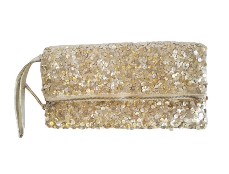 Индия. Цвет золотистый, декорирована золотистыми паетками. Из текстиля. Застежка молния. Сочетание винтажного стиля и современности. Для удобства использования есть ручка на кисть. Длина 29 см, полная высота 28 см, сложенным и закрытым на кнопке 16 см.