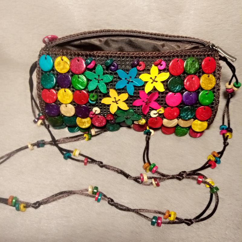 Дуже оригінальна ,Яскрава сумочка слінг, клатч крос боді. виконаний в етно стилі з кокосової шкарлупи. Стан нове ( без бирки).
