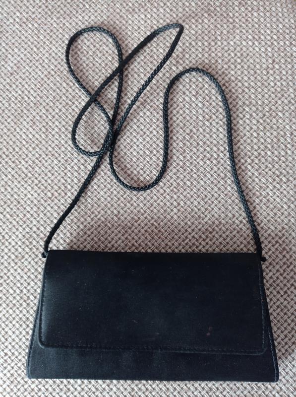 Очень аккуратный клатч черного цвета, текстиль, на кнопке. Длина низа 22см, вверху 19, высота 11, ручка 60. Состояние отличное.