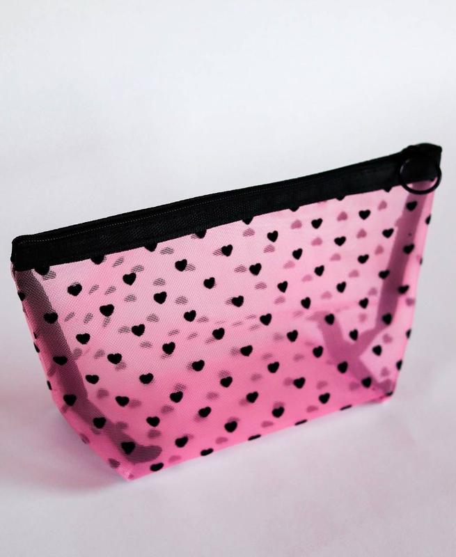 Милая косметичка в прозрачно-розовую сеточку с сердечками